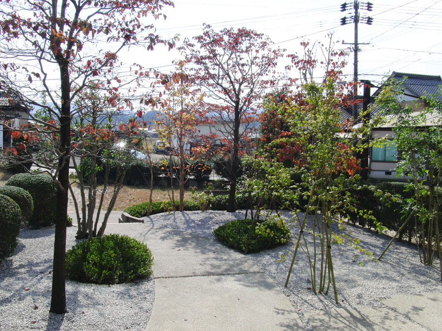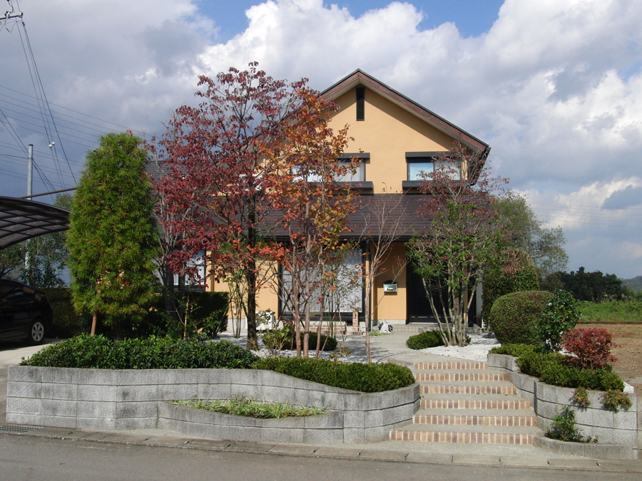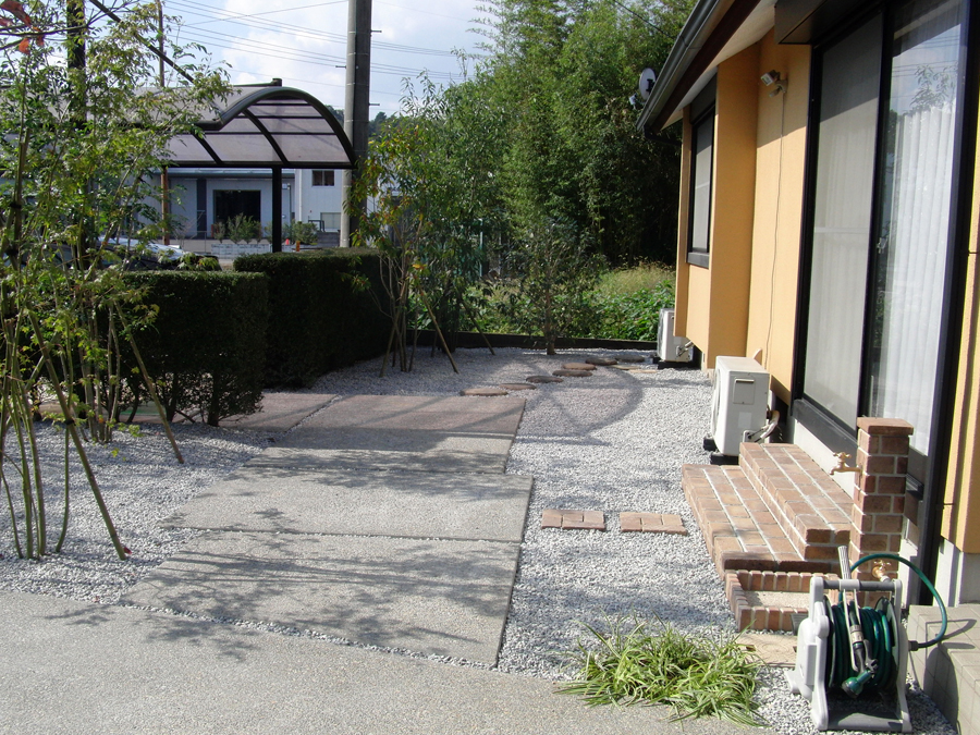 夫婦共稼ぎでなかなかお庭の手入れが出来なくて…。自然な林のイメージをそのままに、手入れの楽な木を残してアレンジしてみました。古くなった枕木のアプローチを、レンガと素地洗い出しのアプローチにリフレッシュしました。