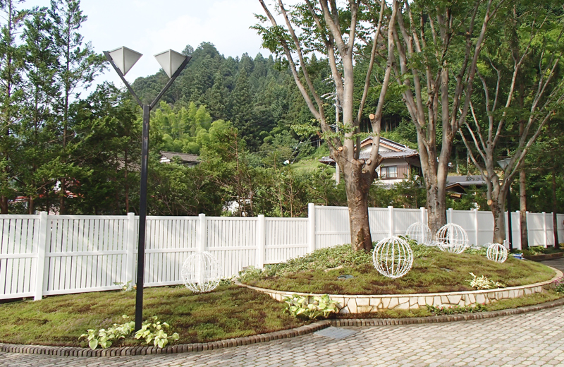 高木は、伐採・剪定しすっきりとさせました。大きなケヤキ3本の後ろには、白色のロイヤルフェンスを設置する事により、緑が良く映えるようになりました。メインの植栽として、北海道より直送した『ハーブな絨毯(種類はクリーピングタイム)』を植栽しました。来年の4月~5月頃には、桃色の花が綺麗に咲きほこることでしょう。