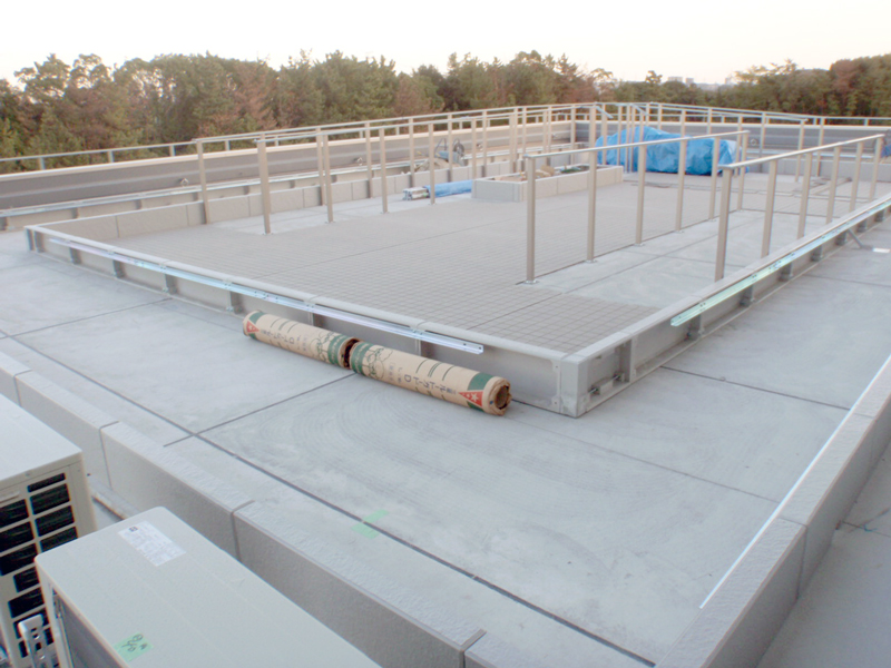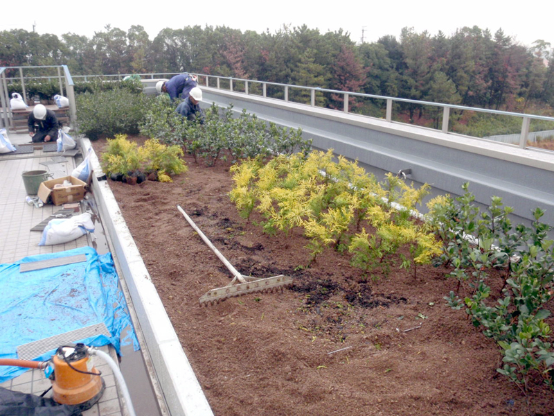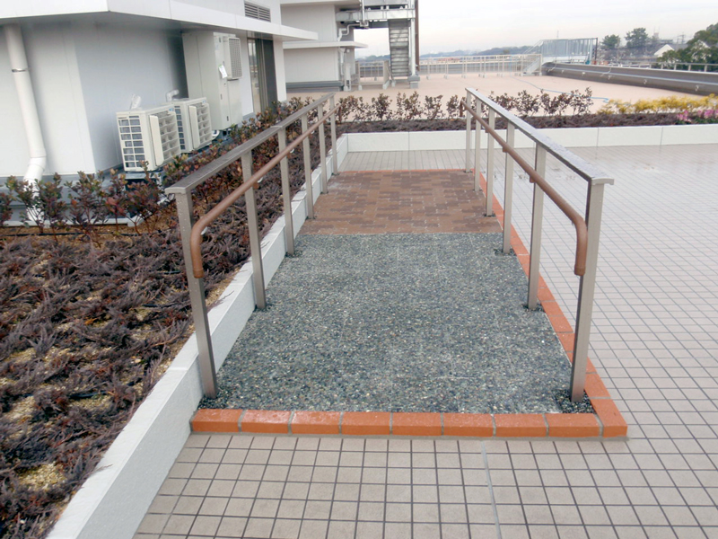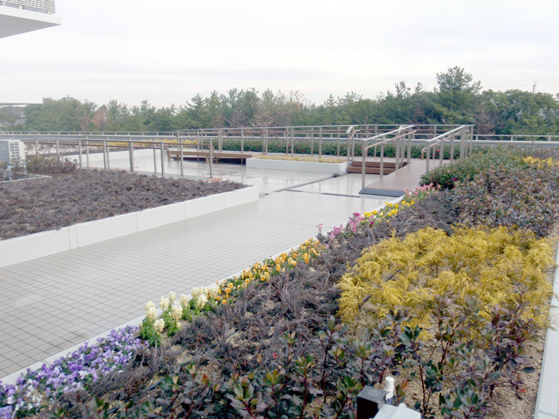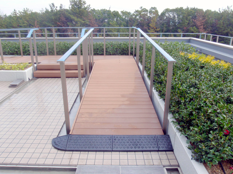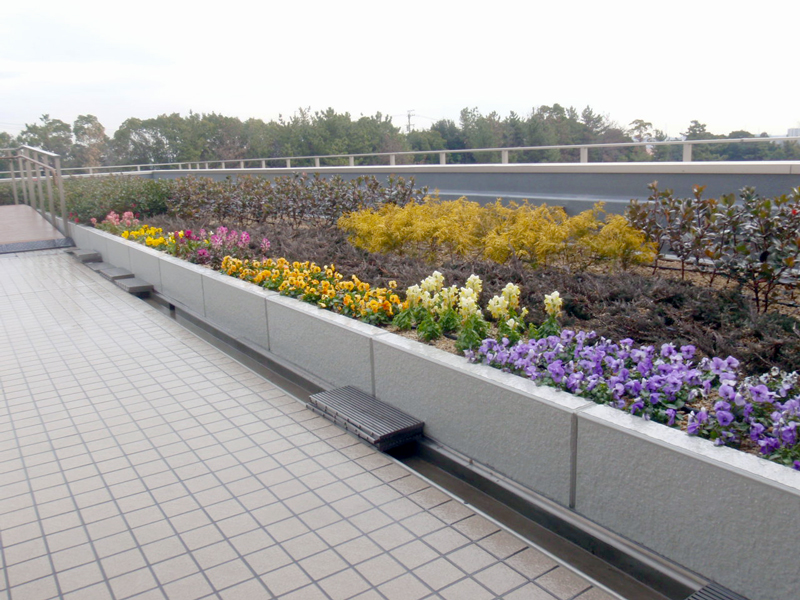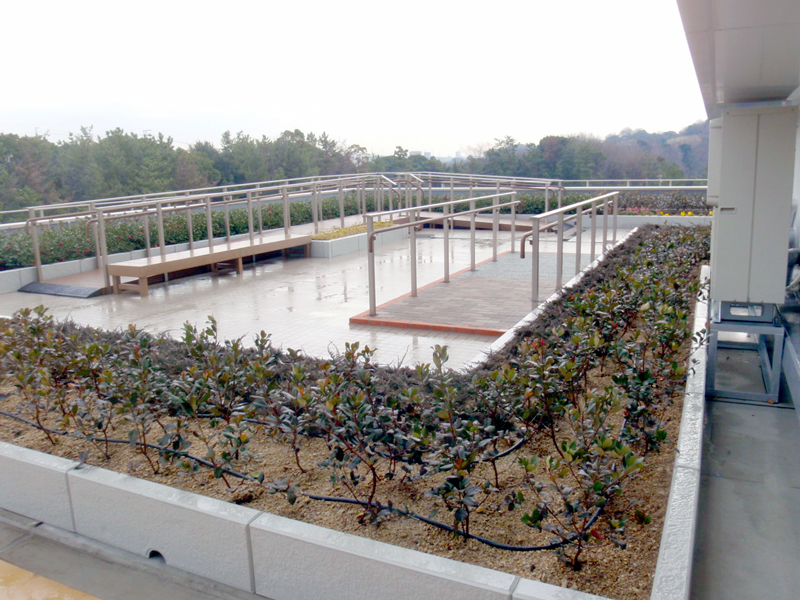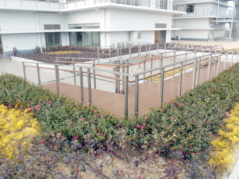今回病院の4F屋上に歩行訓練するための「疑木スロープ」や患者さんの憩いの場所となる花壇を施工しました。花壇の土止めには「パパット」と言う製品を使い、ブロックなどと違い養生期間が必要ない分施工が早くすみ、名前通りパパット施工ができました。