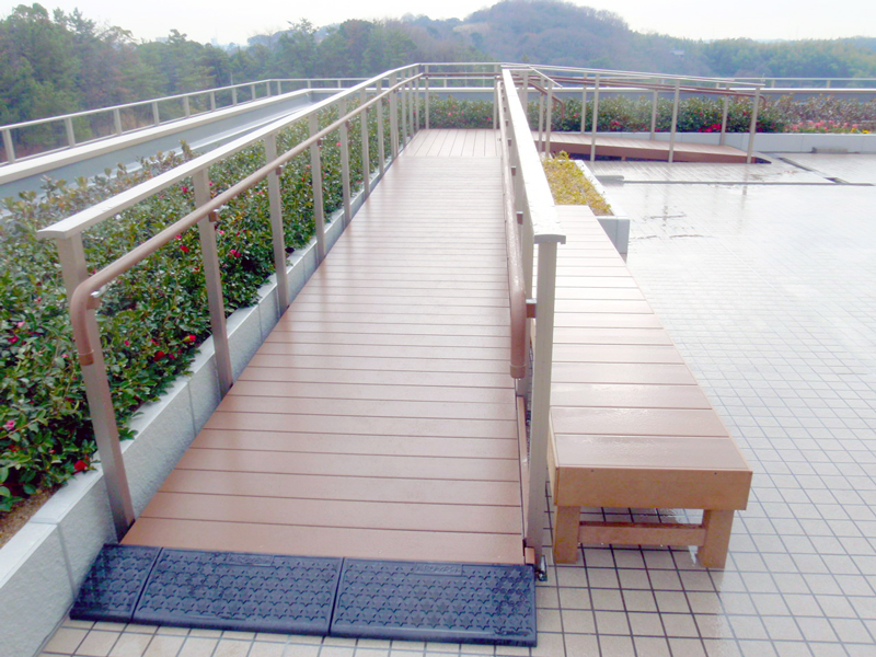 坂の歩行訓練用に疑木のデッキでスロープをつくりました
