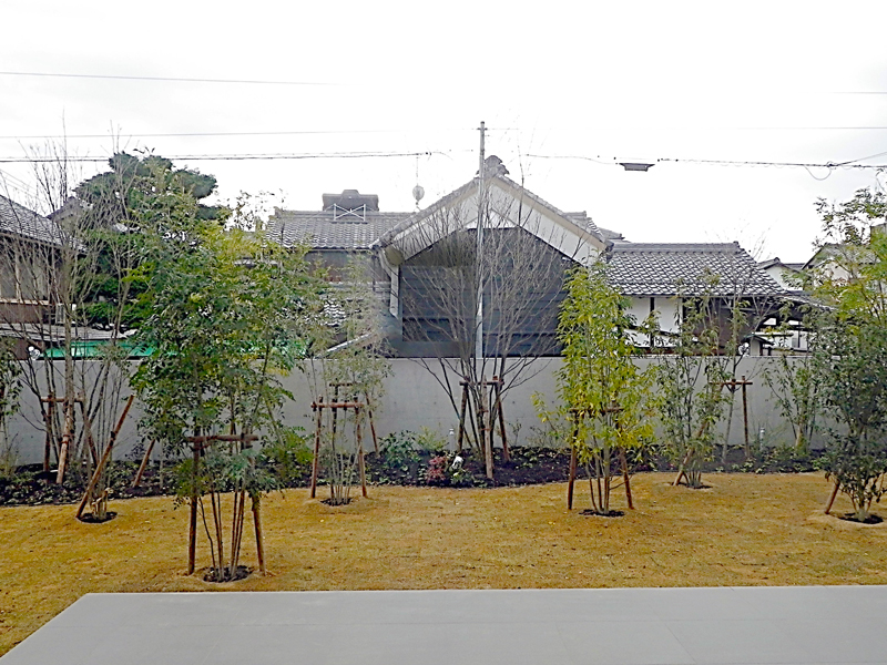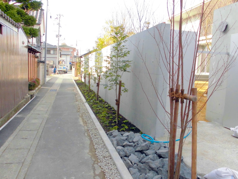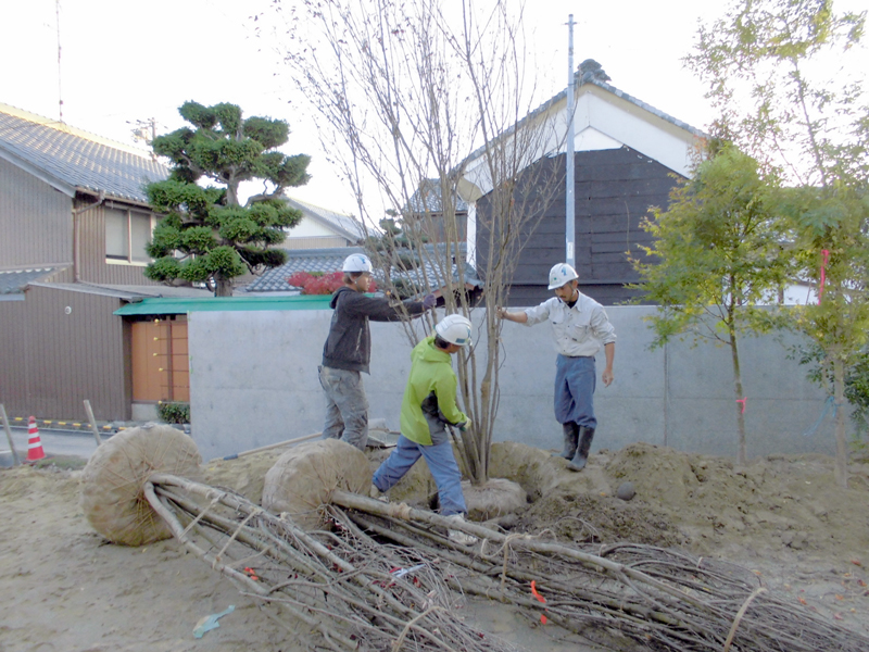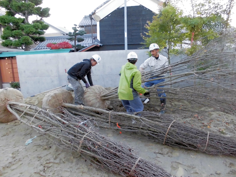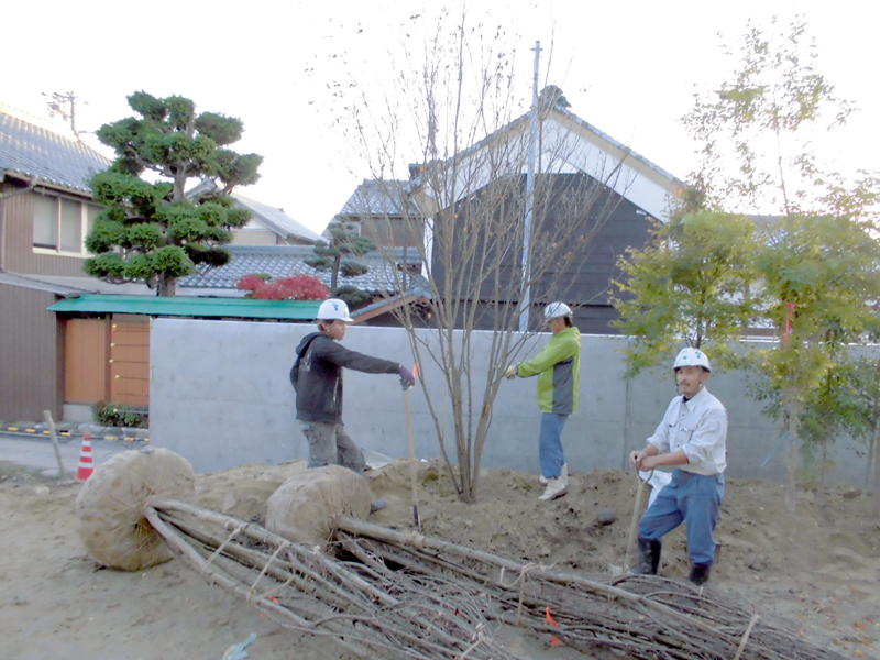 植栽樹木の多くは5~6メートルくらいの高木で、植えるのにも一苦労でした。