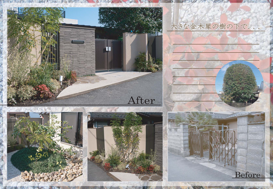 塀とアプローチのリノベーション。 暖かみのある色で統一し、たくさんの植栽をしました。秋になると、シンボルツリーのキンモクセイの香りに誘われ、思わず中に入りたくなってしまいます。
