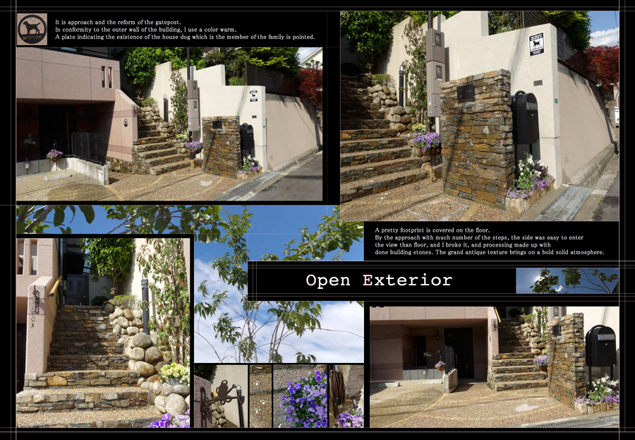 暖かみが感じられる、天然石やアンティーク素材を贅沢に使いアプローチと門柱をリフォームしました。家族の一員であるわんちゃんの足跡がスタンプされ、アプローチに和みのアクセントとなりました。