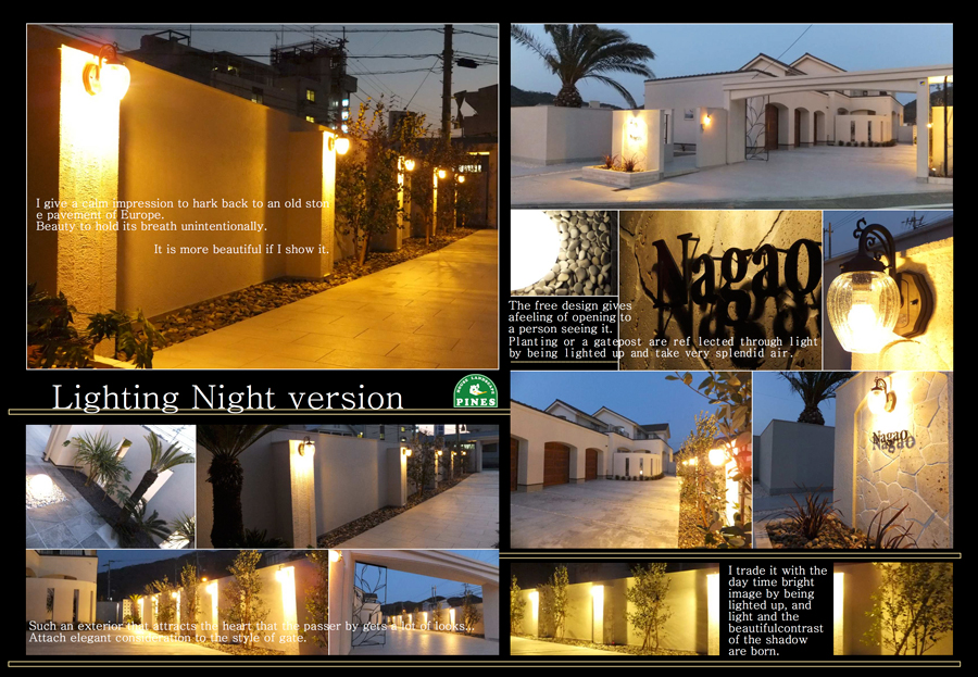 エントランスに延びる長いアプローチには、優しくオレンジ色にライトアップされ日中と違った表情を見せてくれます。また、植栽も外灯でライトアップされて出来た影もが優し雰囲気作りになりました。