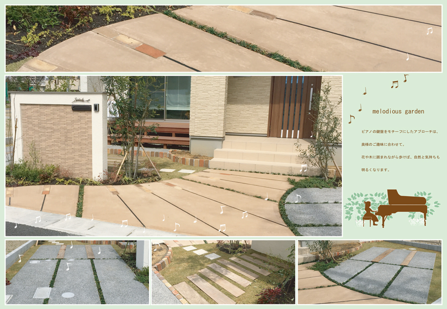 あたたかみのある建物の外観に調和した、緩やかな曲線を描き鍵盤をモチーフにした可愛らしいアプローチ。花や木々に囲まれながら、まるでピアノの音色が聞こえてきそうなお庭です。