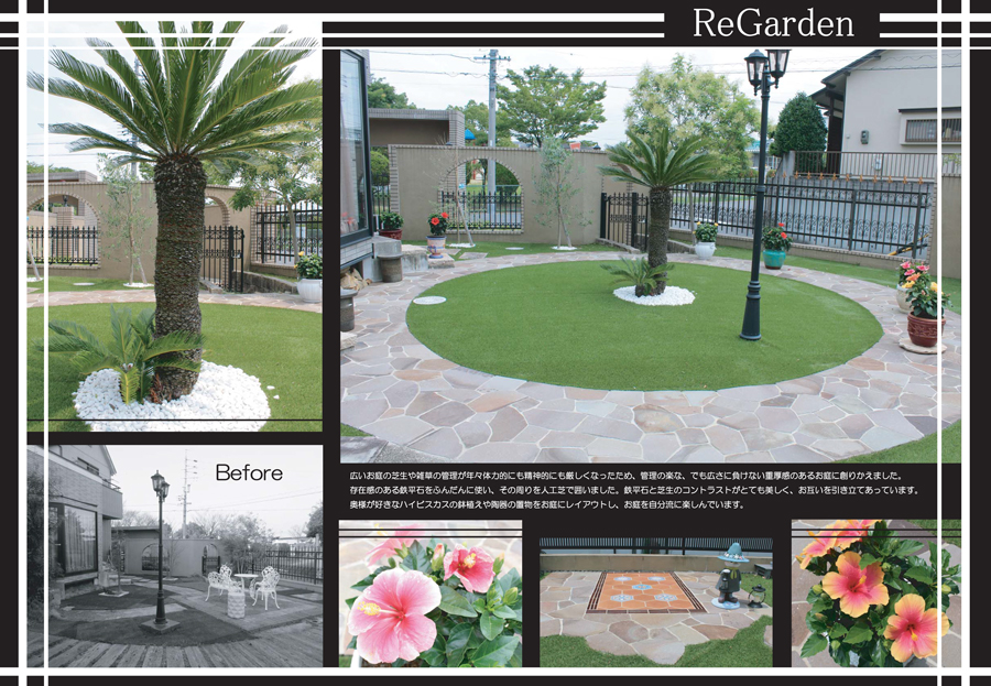 広いお庭の芝生や雑草の管理が厳しくなり、管理が楽でも広さに負けない重厚感のあるお庭に創り変えました。存在感のある鉄平石をふんだんに使い、周りを人工芝で囲い、鉄平石と芝生のコントラストがとても美しく、お互いを引き立てあっています。