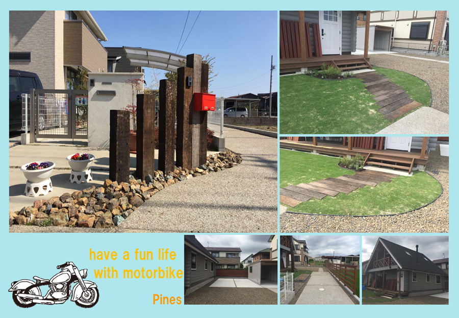 おうちの屋根の形を想わせる枕木立て込みの門柱に、誘われるように奥へと進むと、ご家族の憩いのお庭がバイクのための倉庫を設え、広々としたお庭を趣味のための空間として最大限に活用することができます。
