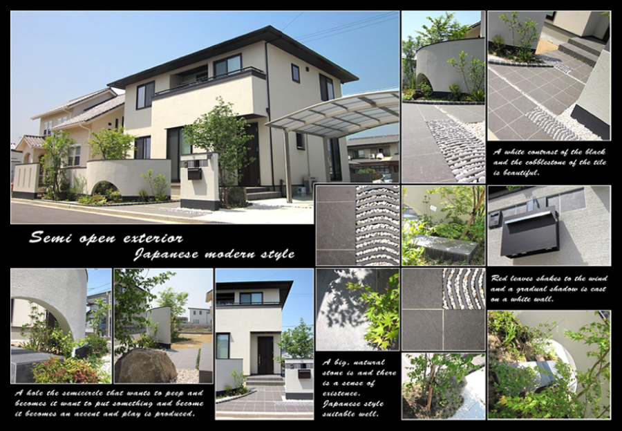 白い壁とグレーの石貼りアプローチ。草花が見え隠れする半円のくり抜き窓が特徴のモダン和風な空間です。