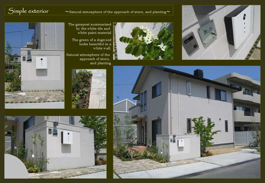 真白なタイルがシャープな印象の壁に、自然石と樹木でナチュラルな雰囲気をプラスしたアプローチです。