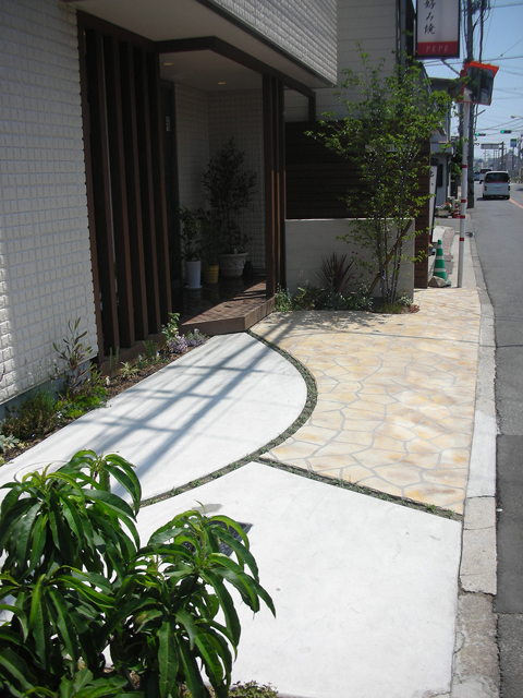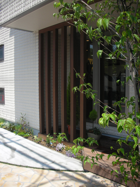 お客様の中には、車椅子でお越しになる方もみえるので、シンボルツリーのヤマボウシの後ろに、ウッドのスロープをつくってもらいました。