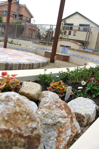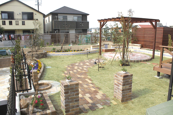 バーベキューなど家族や友人達と集まれるお庭が欲しかったので、テーブルなどを置ける石貼りの丸いテラスと木のパーゴラや、たくさんの花壇、壁泉や池など、色々なアイデアで、すてきに演出していただきました。人がたくさん集まったり、お花を植えることがすごく楽しみです。