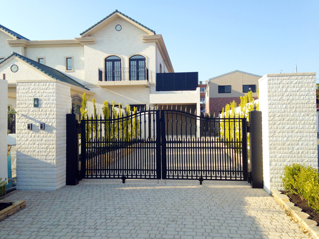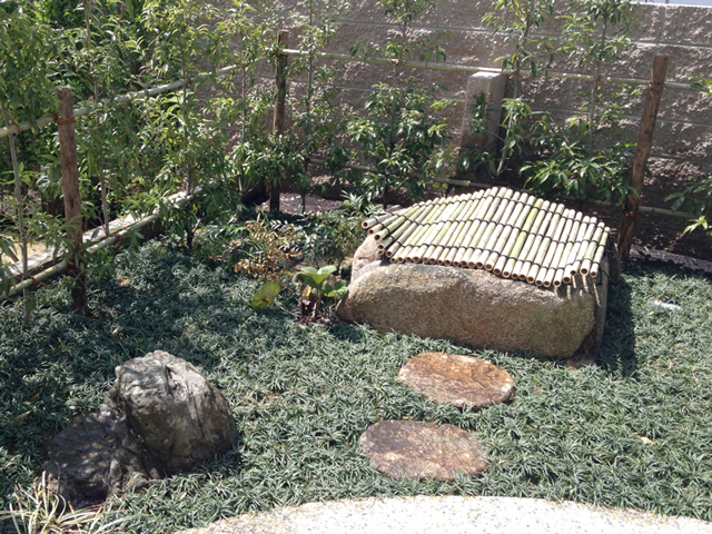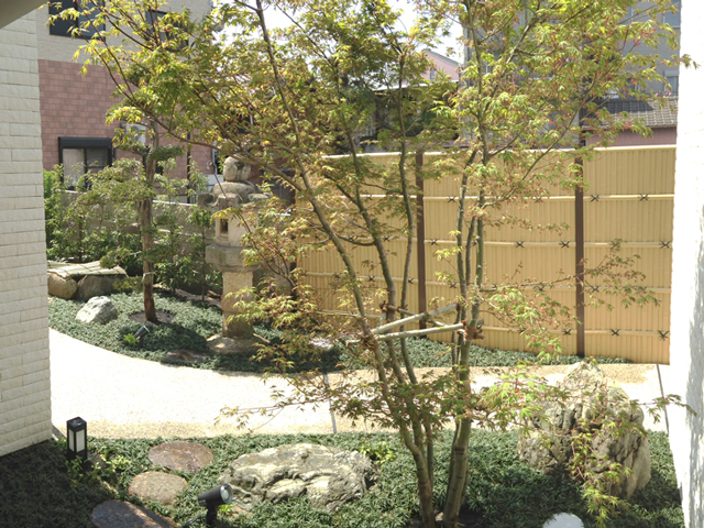 和室からの視線に考慮して、目隠しの人工生垣を配置しています。