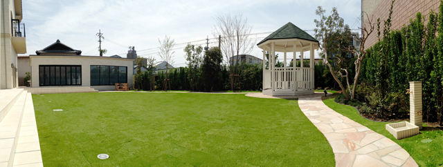 広い芝生広場を乱形石張りの園路が囲っています。庭の奥は高く土盛をし、立体感を表現しました。フォーカルポイントとしてガゼボを配置し、プール棟には長さ10mの温水プールがあり横にはバーベキュー炉を配置。