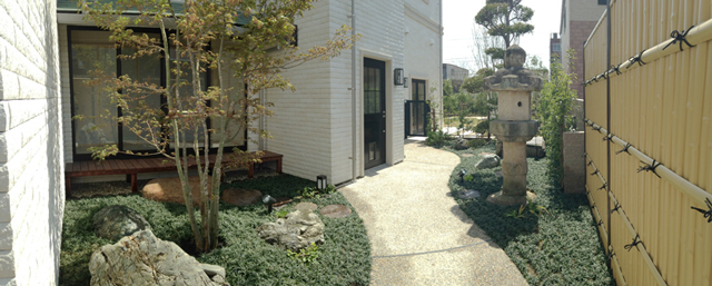 和風庭園は勝手口通路となっています。また、旧住宅の景石、灯篭、マキを配置し歴史を継承しています。